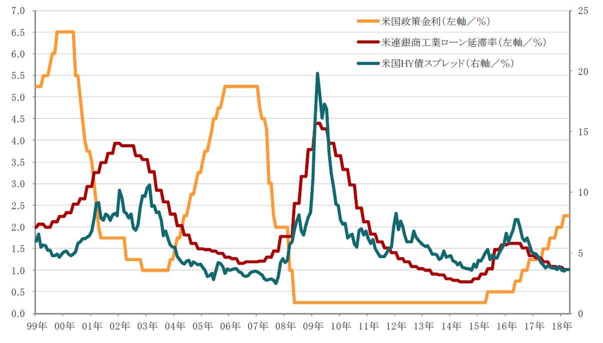 過去を振返ると、リーマンショック前の2004年の利上げ開始後、すぐには商工業ローンの延滞率は上昇せず、ハイイールド債のスプレッドも縮小していました。その後、金融引き締めが終了し金融緩和に転じ始める頃から商工業ローンの延滞率が上昇し始め、スプレッドも拡大していきました(図表2) 。