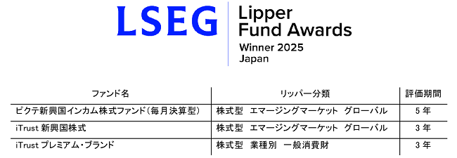 弊社が運用する「ピクテ新興国インカム株式ファンド(毎月決算型)」、「iTrust新興国株式」、「iTrustプレミアム・ブランド」の3ファンドが、LSEGリッパー・ファンド・アワード・ジャパン 2025において最優秀ファンド賞を受賞したことをお知らせします。3ファンド全て2024年に続いて2年連続受賞となります。