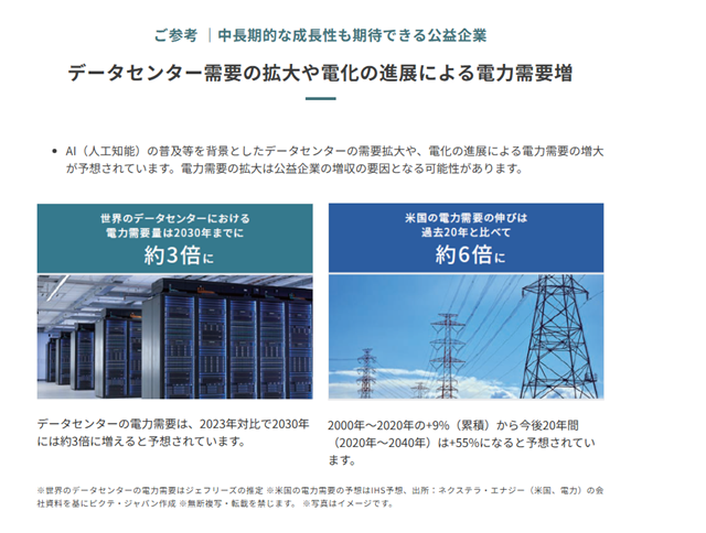 公益セクターは、景気動向に左右されにくく、安定した業績と相対的に高い配当利回りを有するディフェンシブな特性が特徴です。加えて、近年はAI(人工知能)やテクノロジーの進展に伴う電力需要の増加など、長期的な成長要因も期待される分野です。