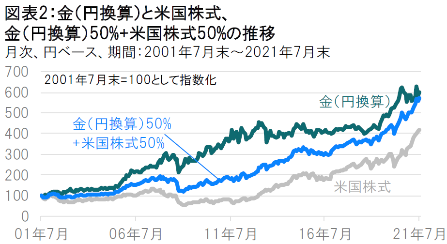 この背景としてはリーマン・ショック時(2008年)のような金融市場の混乱時に金を組み合わせていたことで、米国株式の単体投資よりも下落率が抑えられたことがあげられます。