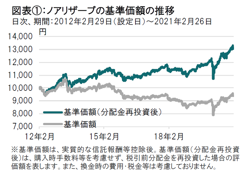 このような状況下、ノアリザーブの基準価額(分配金再投資後)は小幅下落となりました(図表③参照) 。