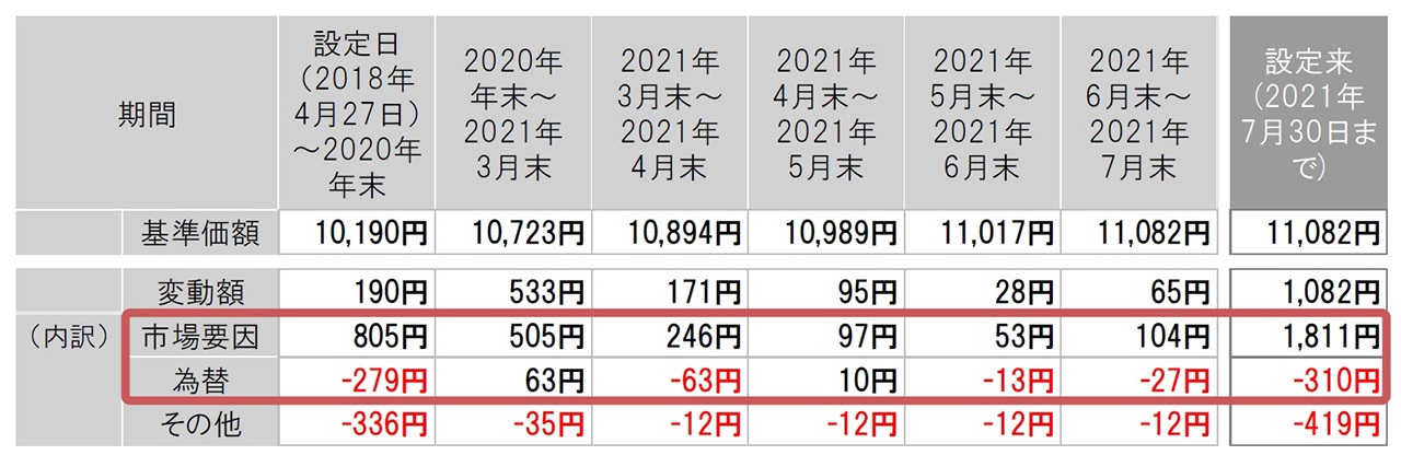 アルテの2021年7月30日の基準価額は、前月末比で+65円(+0.6%)の11,082円となりました。+65円の内訳は、市場要因+104円、為替-27円、その他-12円です。