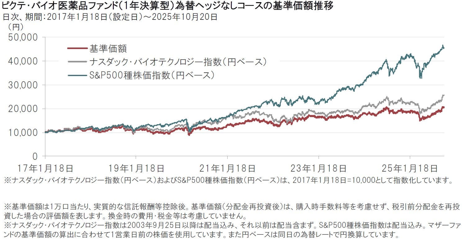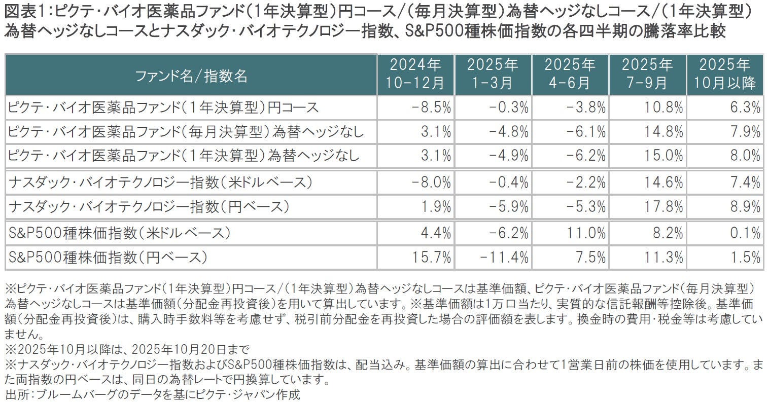 2025年7-9月にピクテ・バイオ医薬品ファンドの3コースは、「ピクテ・バイオ医薬品ファンド(1年決算型)円コース」が+10.8%、「ピクテ・バイオ医薬品ファンド(毎月決算型)為替ヘッジなし」が+14.8%、「ピクテ・バイオ医薬品ファンド(1年決算型)為替ヘッジなし」が+15.0%と、それぞれ10%を超える上昇となりました。