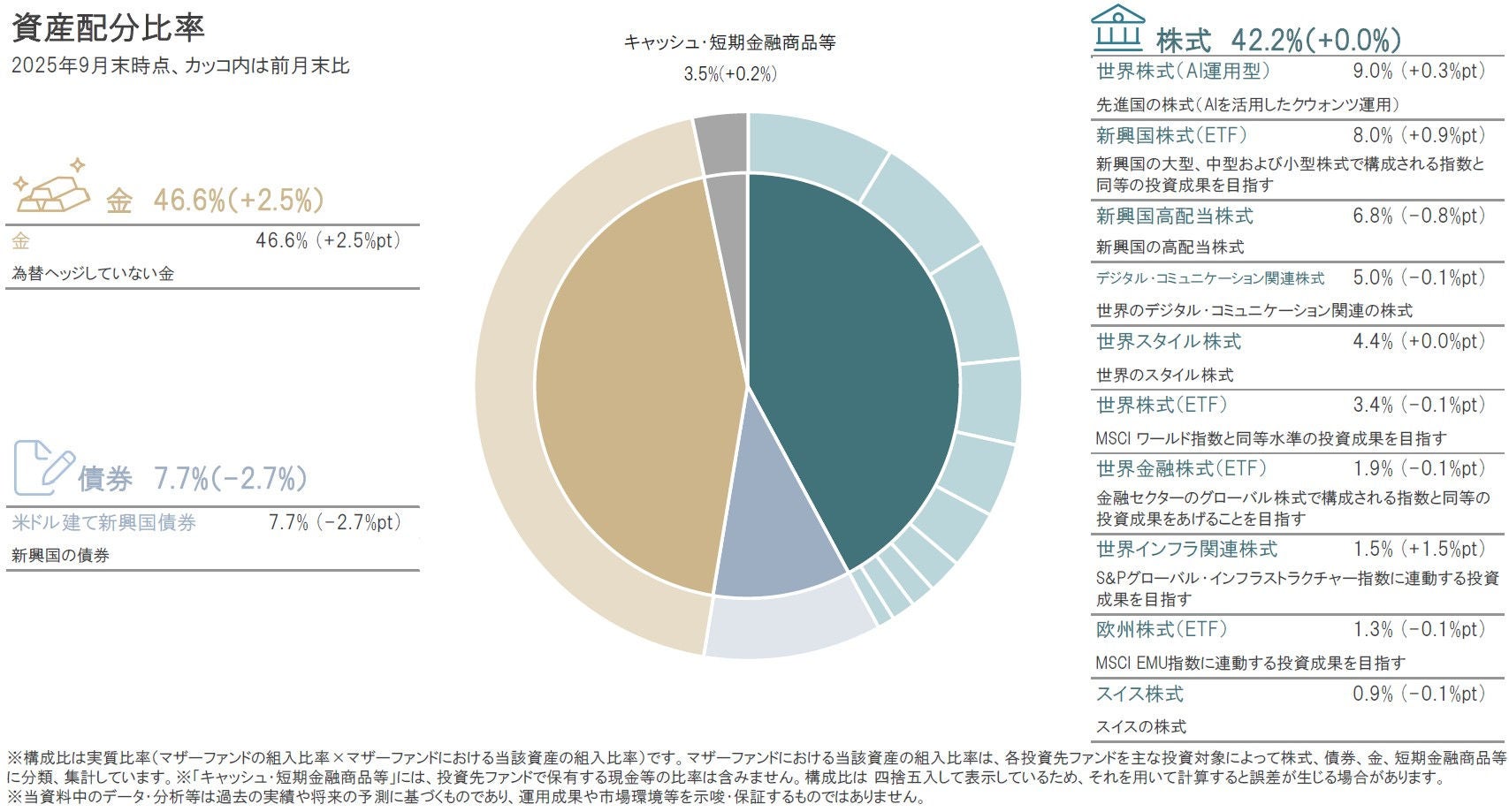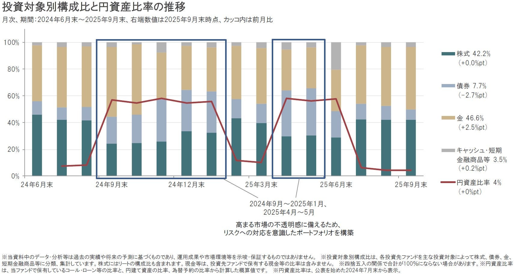2025年9月は、金、キャッシュ・短期金融商品等の組入比率を引き上げ、債券を引き下げました。株式については、前月末とほぼ同水準の組入れとなっています。また円資産比率(円建て資産と円ヘッジの外貨建て資産比率)は、2025年9月末時点で4%としています。