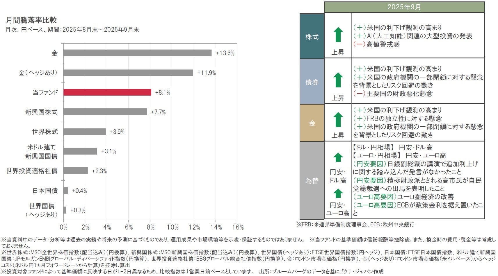 2025年9月は、現地通貨ベースでは、金、世界株式、米ドル建て新興国国債、世界国債、新興国株式がともに上昇しました。また、為替は、円が米ドル、ユーロに対して下落しました。