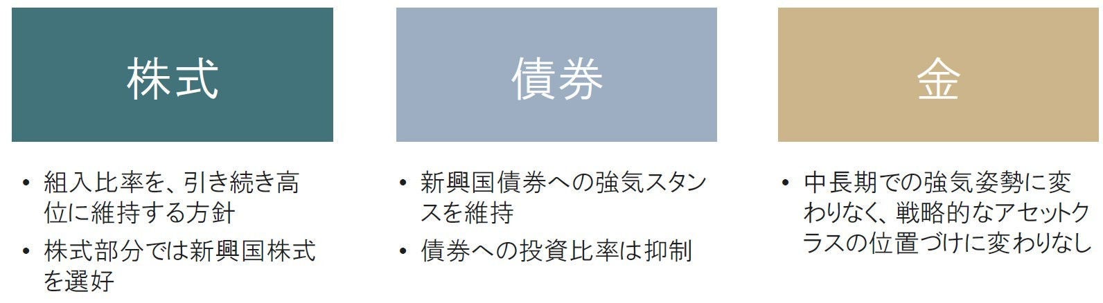 こうしたリスクオンの流れが年末にかけて継続する可能性を考慮し、米国中心に株式市場のバリュエーション(投資価値評価)の割高感には注意を払いつつも、ポートフォリオにおける株式の組入比率を引き続き高位に維持する方針です。その上で、株式部分では新興国株式を選好しており、債券部分でも新興国債券への強気スタンスを継続します。金については中長期での強気姿勢に変わりなく、戦略的なアセットクラスの位置づけに変わりありません。足元では、短期的な金価格上昇および円安に配慮すべく一部ポートフォリオの調整を検討しています。
