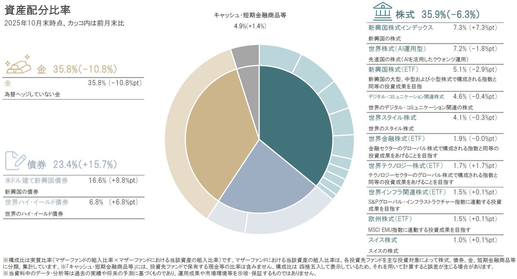 2025年10月は、債券、キャッシュ・短期金融商品等の組入比率を引き上げ、株式、金を引き下げました。また円資産比率(円建て資産と