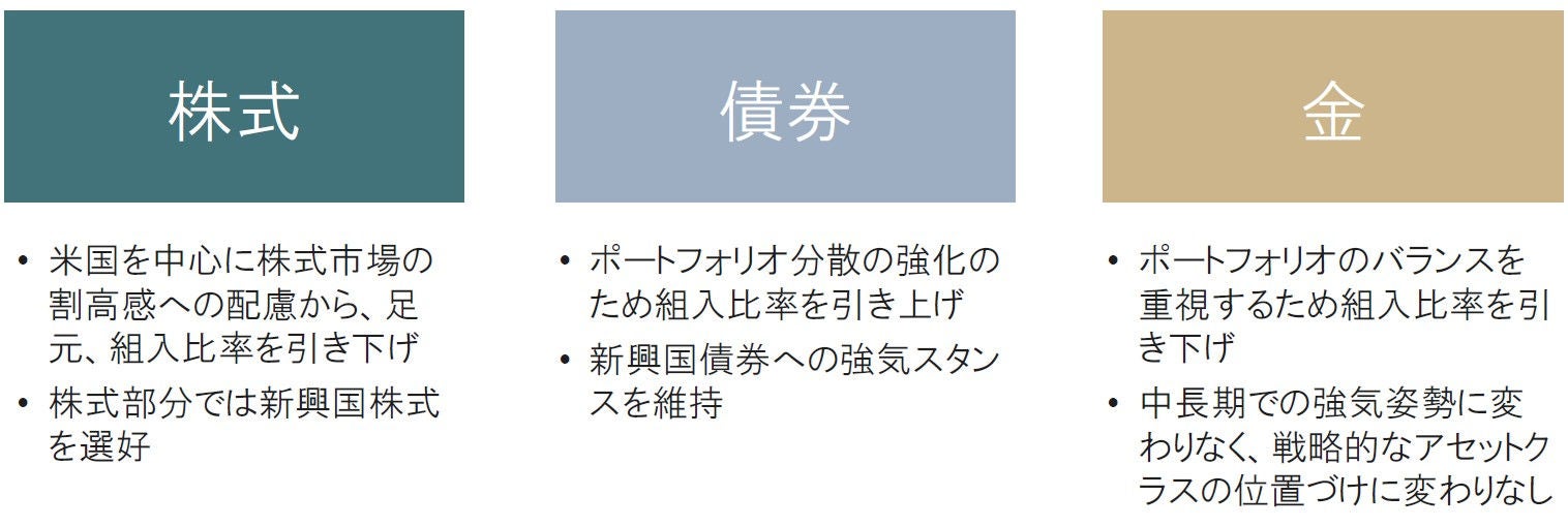 その上で、株式部分では新興国株式を選好、債券部分でも新興国債券への強気スタンスを継続します。金については中長期に見た強気姿勢に変わりなく、戦略的なアセットクラスの位置づけに変わりありません。
