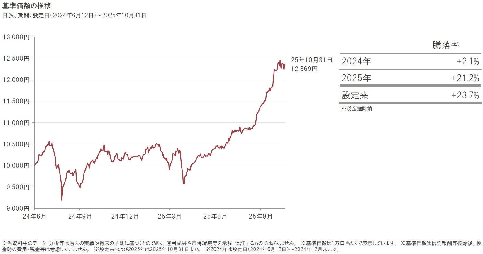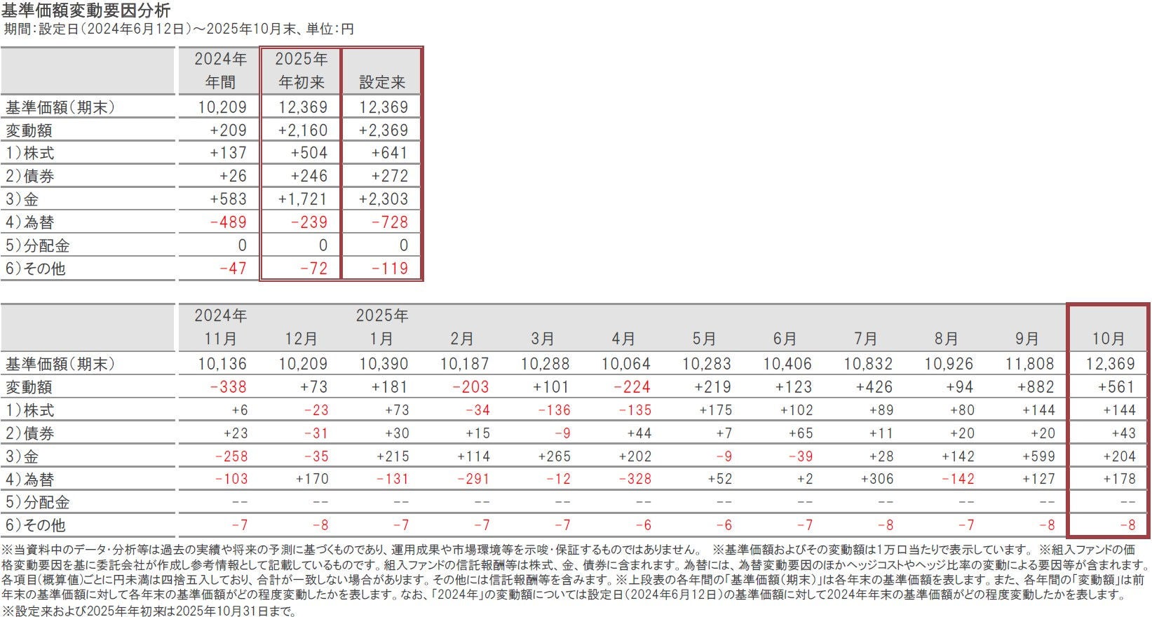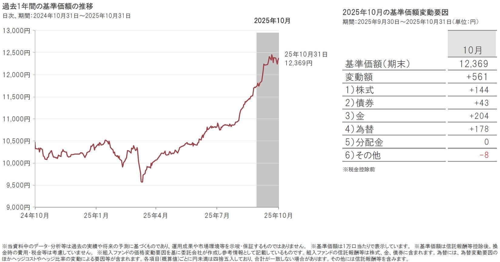 2025年10月31日の当ファンドの基準価額は、前月末比561円上昇(+4.8%)の12,369円となりました。