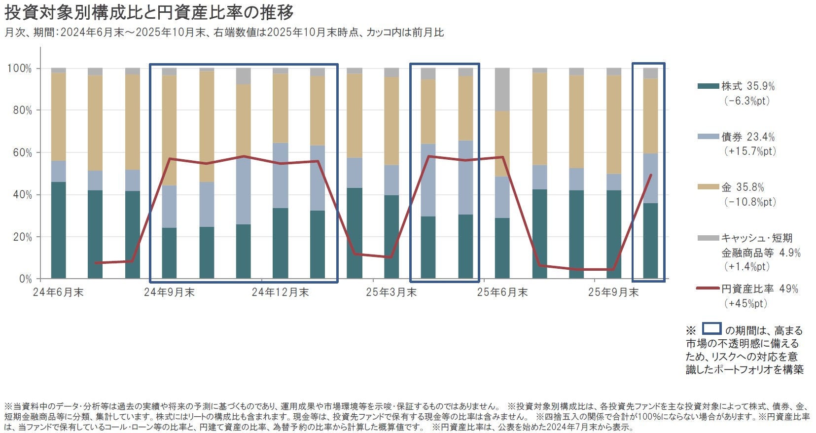 円ヘッジの外貨建て資産比率)は、2025年9月末時点から大きく引き上げ、2025年10月末時点で49%としています。