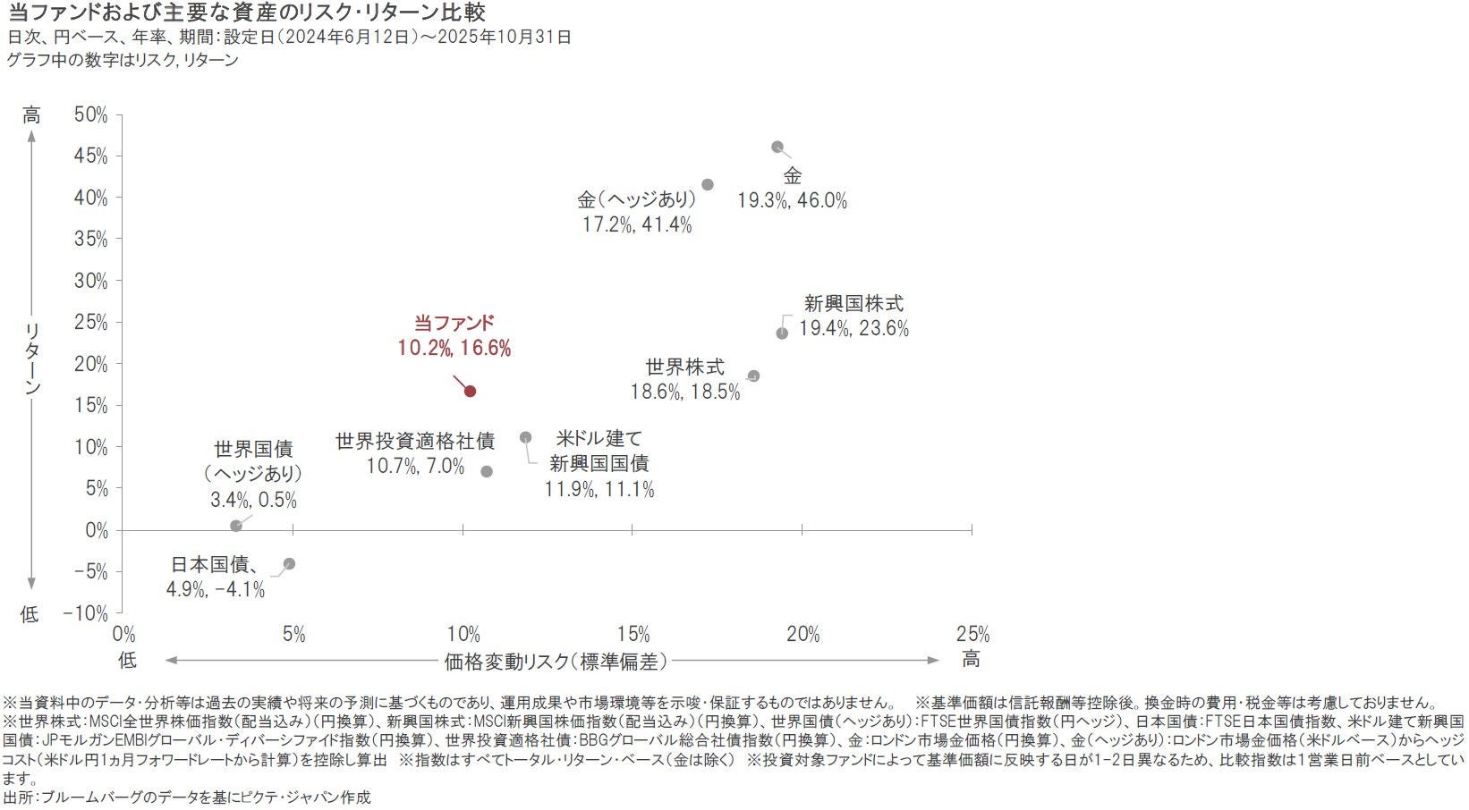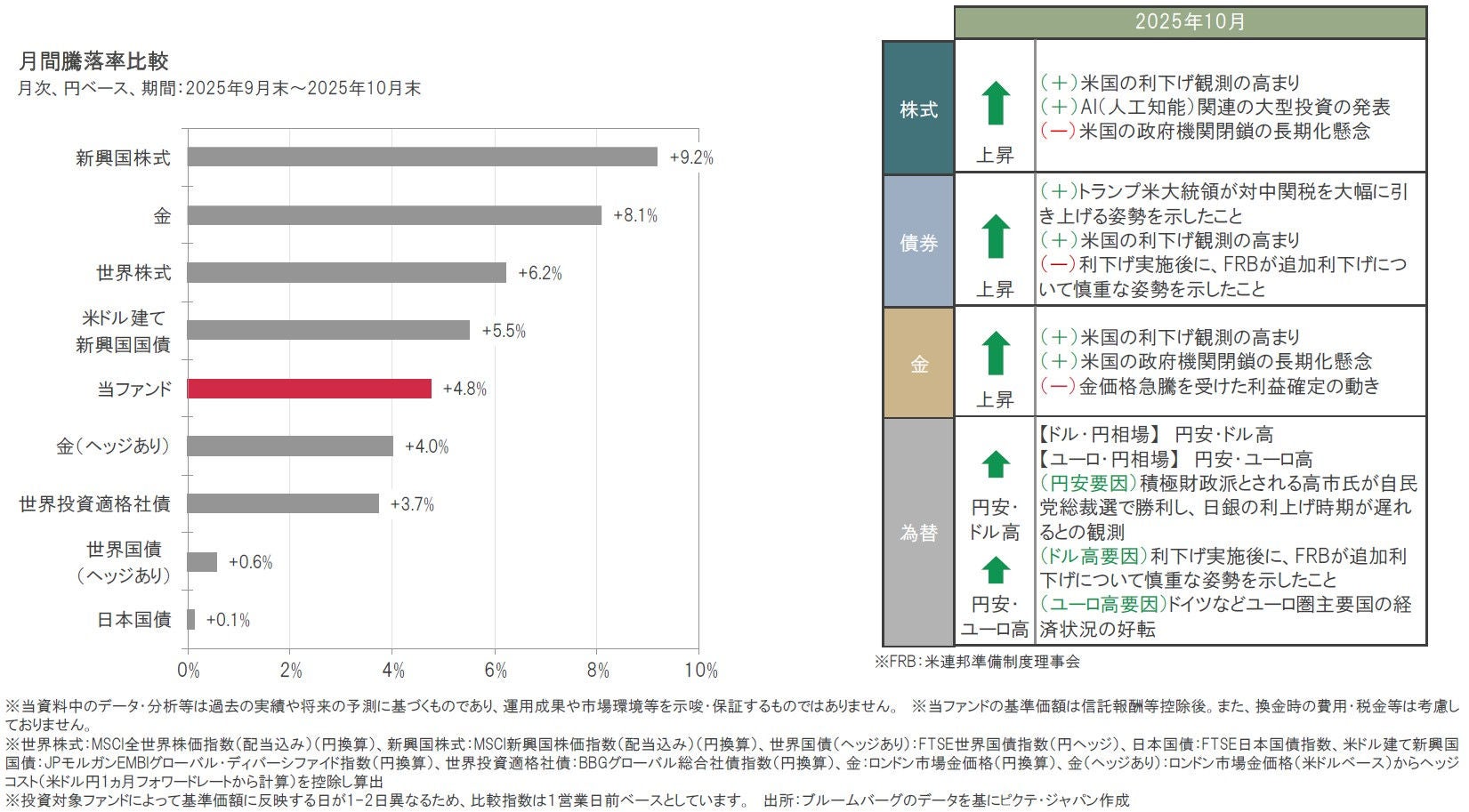 2025年10月は、現地通貨ベースでは、新興国株式、金、世界株式、米ドル建て新興国国債、世界投資適格社債、世界国債、日本国債がともに上昇しました。また、為替は、円が米ドル、ユーロに対して下落しました。