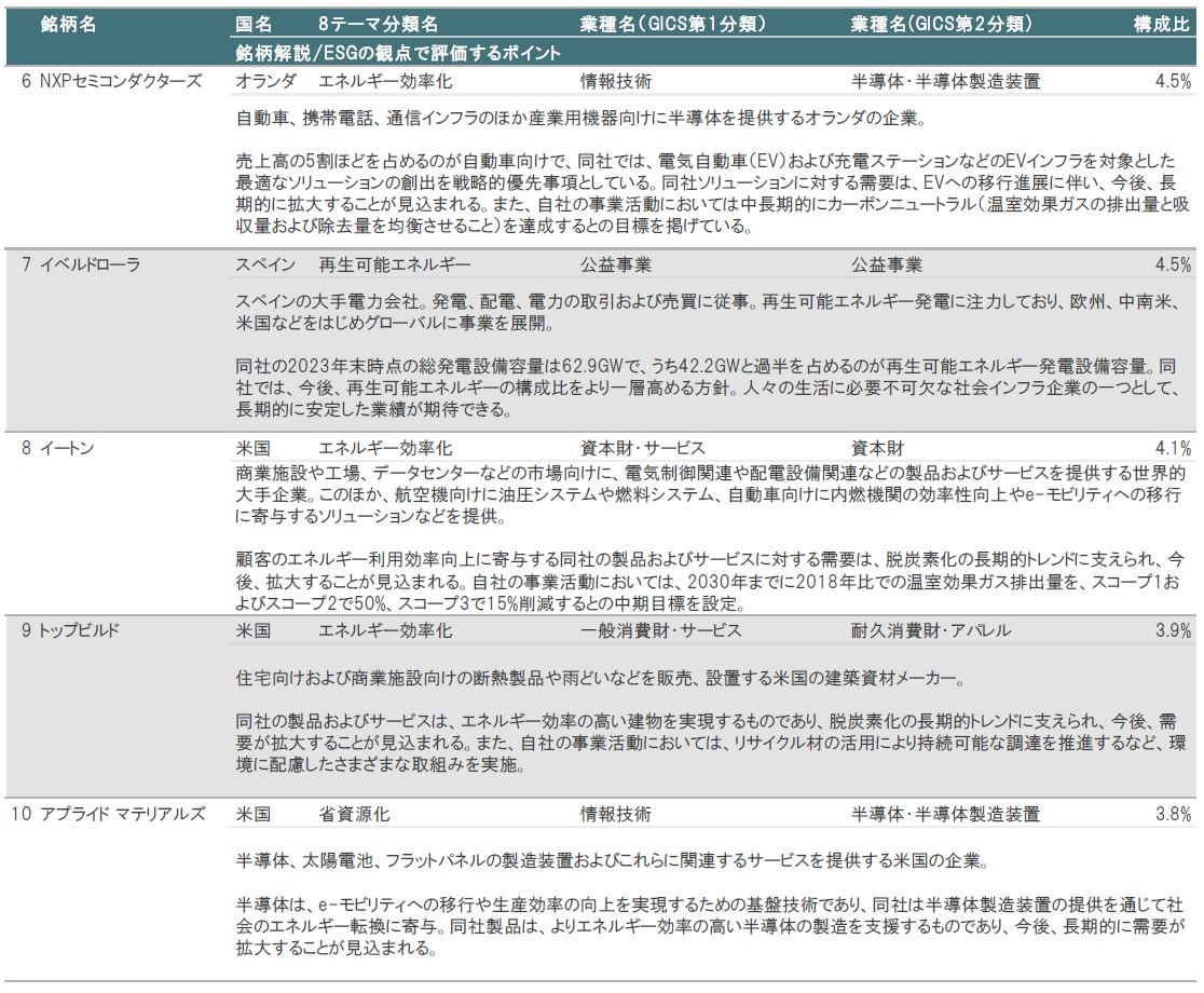2024年12月末時点の組入上位10銘柄は図表2、3のとおりで、このうちマーベル・テクノロジー(エネルギー効率化、情報技術)とブロードコム(エネルギー効率化、情報技術)は、ともにデータセンターの電力消費の削減に寄与するカスタムAI半導体を提供しています。