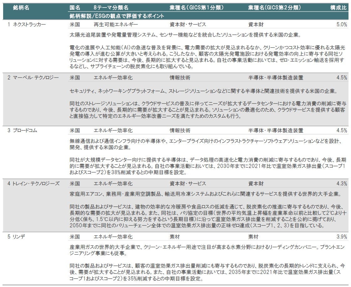 図表3、4に示したとおり、2025年9月末時点の組入上位10銘柄の内訳は、①8テーマ分類別では、エネルギー効率化が7銘柄、再生可能エネルギーが2銘柄、省資源化が1銘柄、②業種別(GICS第1分類)では、情報技術が4銘柄、資本財・サービスが3銘柄、公益事業が2銘柄、素材が1銘柄となっています。