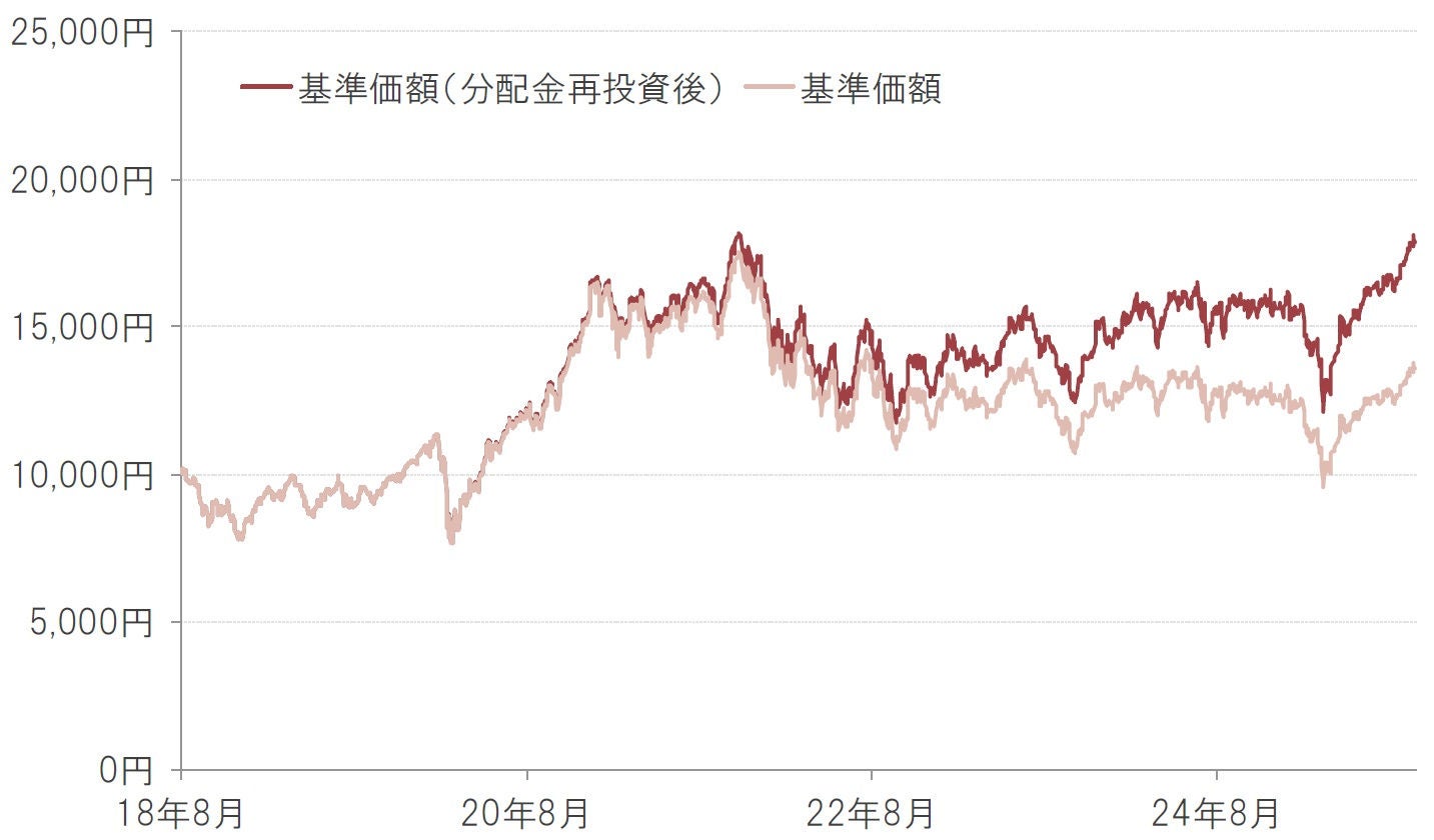 ※基準価額は1万口当たり、実質的な信託報酬等控除後。基準価額(分配金再投資後)は、購入時手数料等を考慮せず、税引前分配金を再投資した場合の評価額を表します。換金時の費用・税金等は考慮していません。
