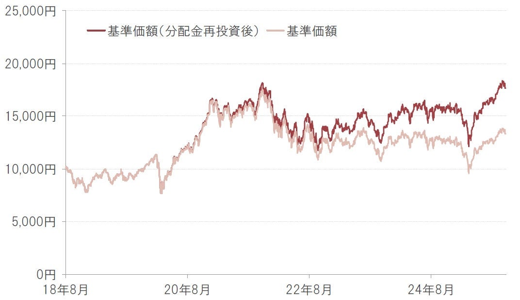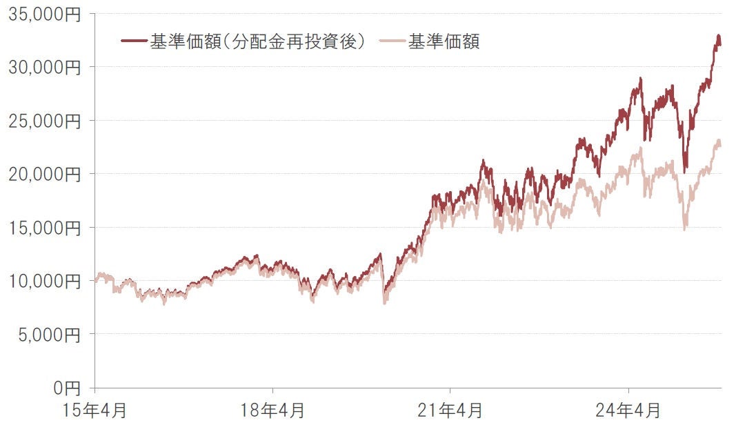 ※基準価額は1万口当たり、実質的な信託報酬等控除後。基準価額(分配金再投資後)は、購入時手数料等を考慮せず、税引前分配金を再投資した場合の評価額を表します。換金時の費用・税金等は考慮していません。