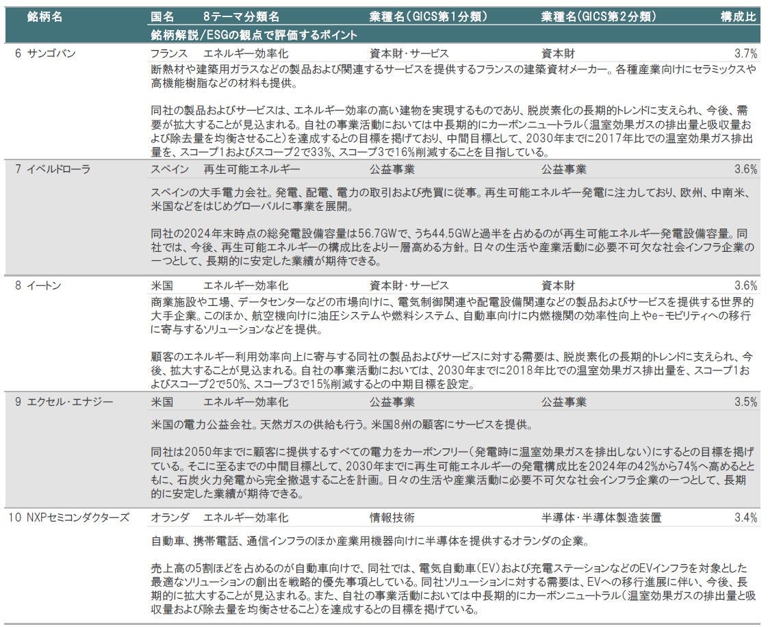 図表3、4に示したとおり、2025年10月末時点の組入上位10銘柄の内訳は、①8テーマ分類別では、エネルギー効率化が7銘柄、再生可能エネルギーが2銘柄、省資源化が1銘柄、②業種別(GICS第1分類)では、情報技術が4銘柄、資本財・サービスが4銘柄、公益事業が2銘柄となっています。2025年10月末時点の組入上位10銘柄の顔ぶれを2025年9月末時点と比較すると、リンデ(エネルギー効率化、素材)に代わって、サンゴバン(エネルギー効率化、資本財・サービス)が再び登場しました。