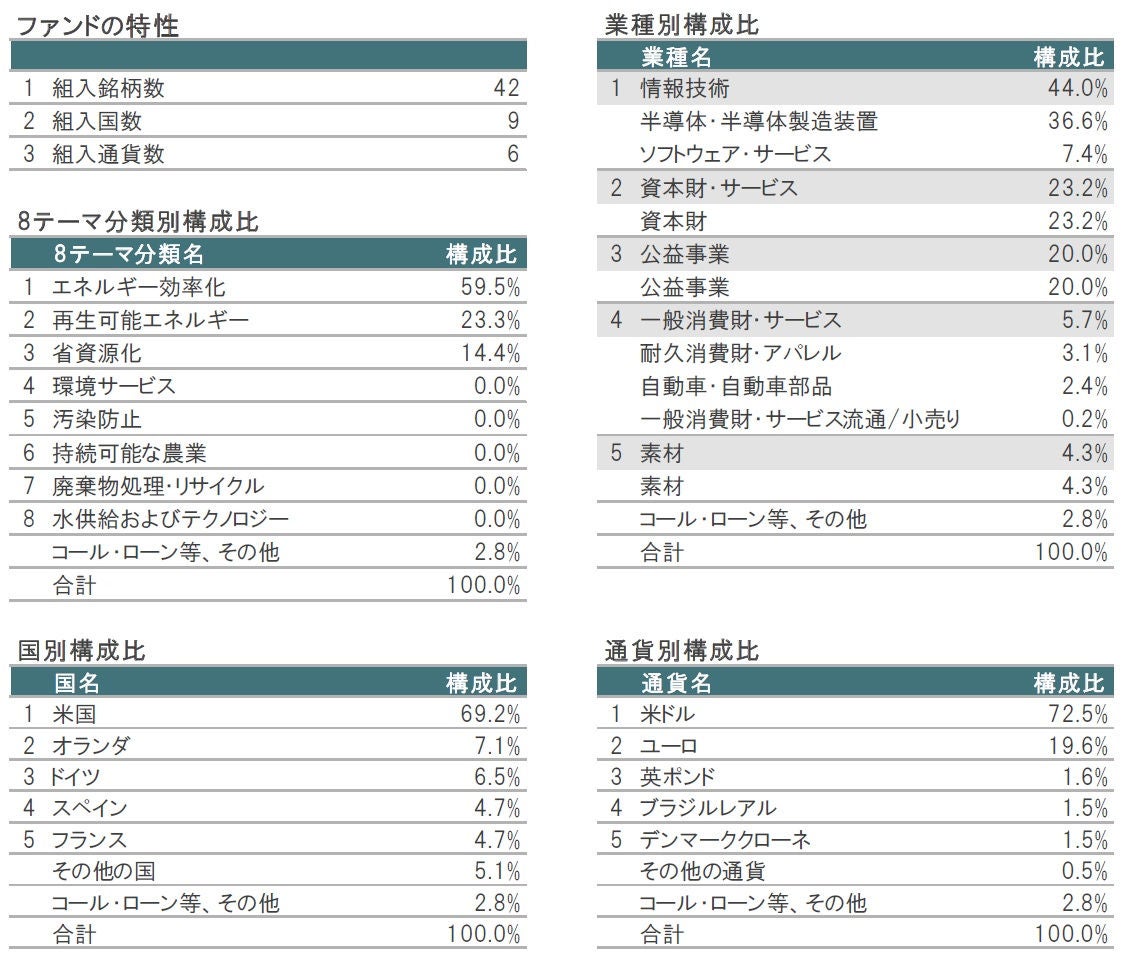 8テーマ分類別構成比については、エネルギー効率化が59.5%、再生可能エネルギーが23.3%、省資源化が14.4%となっています。業種別構成比(GICS第1分類)については、情報技術の比率が44.0%と大きな部分を占めていますが、組入業種は多岐にわたります。