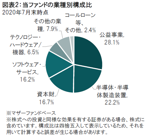 そのため全体でみると、公益事業、半導体・半導体製造装置、資本財、ソフトウェア・サービス、テクノロジー・ハードウェア/機器の5業種で組入全体の約90%を占めています(図表2参照)。