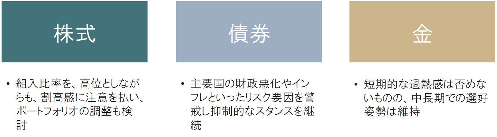 こうしたリスクオンの流れが継続する中で株式に対する組入れを高位に保っていますが、割高感に注意を払い、ポートフォリオの調整も検討していきます。債券は主要国の財政悪化やインフレといったリスク要因を警戒し抑制的なスタンスを継続します。金については短期的な過熱感は否めないものの中長期での選好姿勢は維持します。また、円資産比率に関しては国内情勢などを睨みながら柔軟に対応していく方針です。