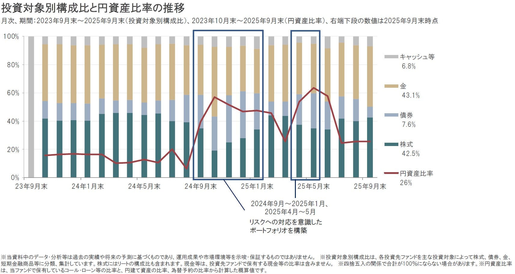 2025年9月末の組入比率は、前月末比で金、株式、キャッシュ等を引き上げた一方、債券を引き下げました。また、円資産比率(円建て資産と円ヘッジの外貨建て資産比率)は、2025年9月末時点で前月末とほぼ変わらず26%としています。