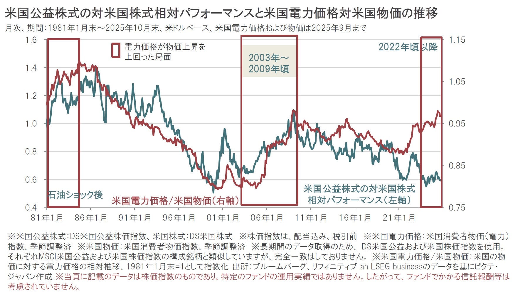過去の実績では、米国の電力価格上昇が米国の物価の上昇を上回る局面では、米国の公益株式の相対パフォーマンスが上昇する傾向がみられました。