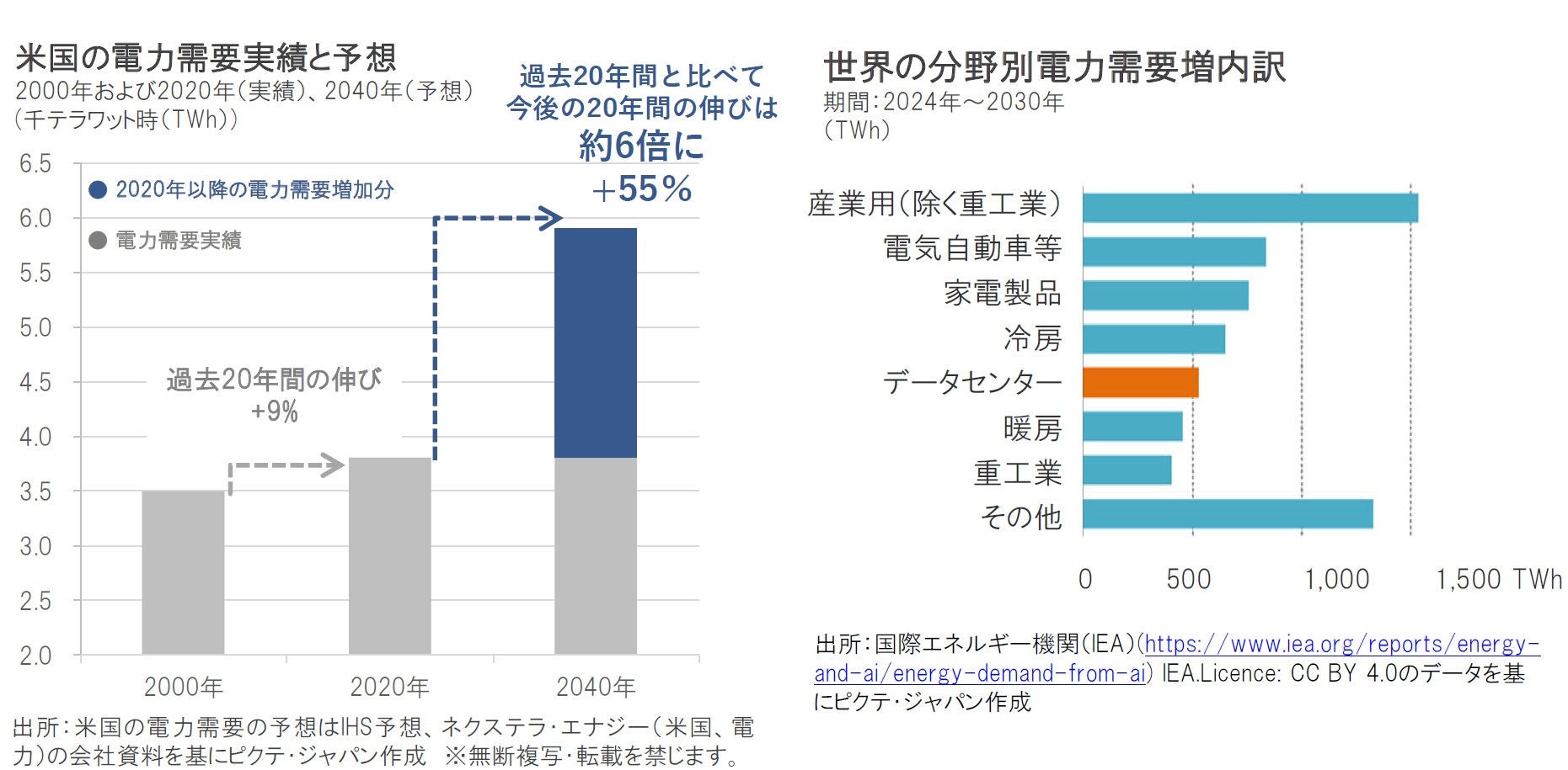 電気自動車の普及、電化の進展、エアコンの普及、AI普及によるデータセンターの増加などによる電力需要増の加速を背景に、米国の電力需要の伸びは、過去20年間の+9%から今後20年間は+55%と、約6倍になると予想されています。