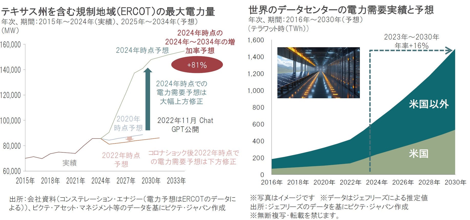 電力需要増加のけん引役の一つは、AIの普及などによるデータセンターの増加です。米国のテキサス州などデータセンターが集積する地域では、2022年11月のChatGPT公開以降、電力需要の長期の予想に大幅な上方修正の傾向がみられます。世界のデータセンター全体の電力需要も年率+16%と大幅な増加が予想されています。