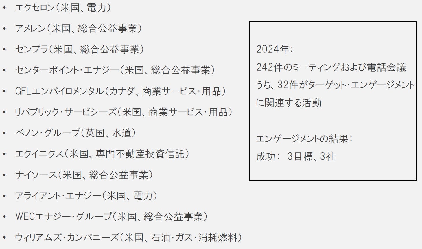 当ファンドの運用チームは、2024年中に、投資先の企業との間で、242件のミーティングおよび電話会議を行いましたが、そのうち32件が、ターゲット・エンゲージメント活動(投資先の企業との直接的なエンゲージメント)に関連するものでした。