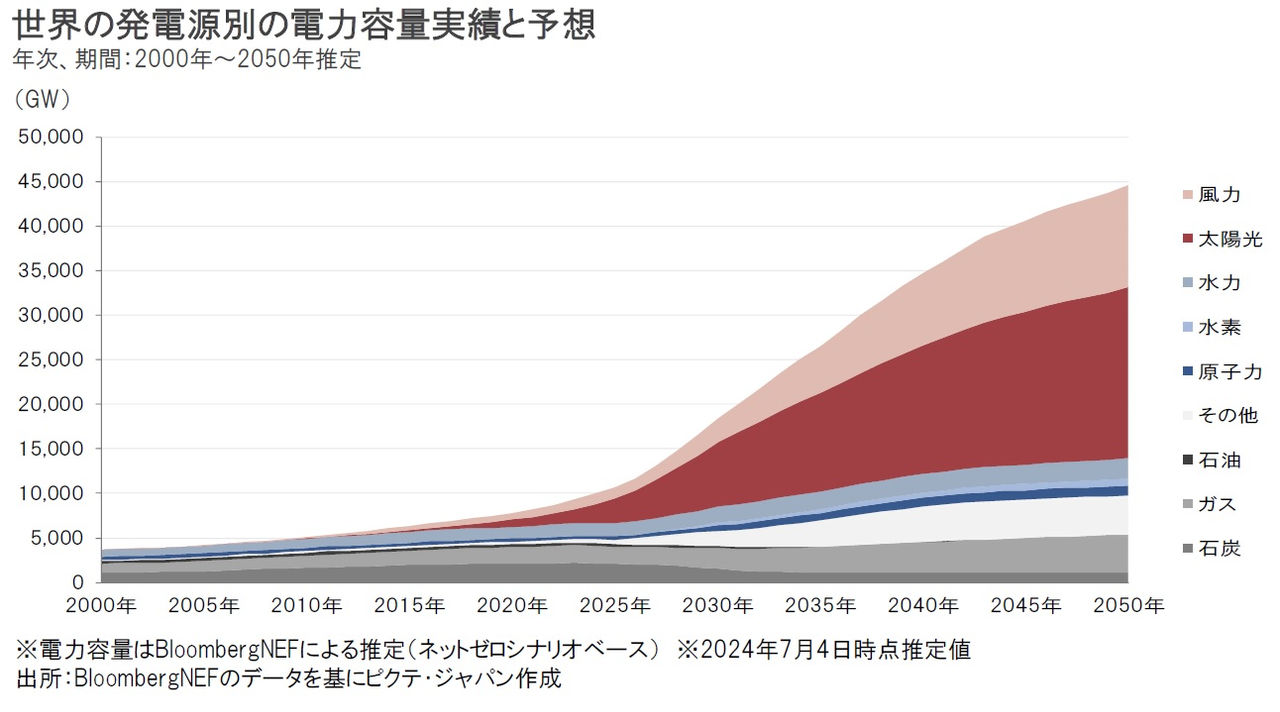 世界的に、1)ネットゼロを推進する政策の動きや風力、太陽光発電などのクリーンエネルギーの発電コストの低下、2)AI(人工知能)関連、データセンターや電気自動車(EV)の増加などによる電力需要の拡大などを背景に、風力や太陽光発電中心に電力設備の拡大が予想されています。