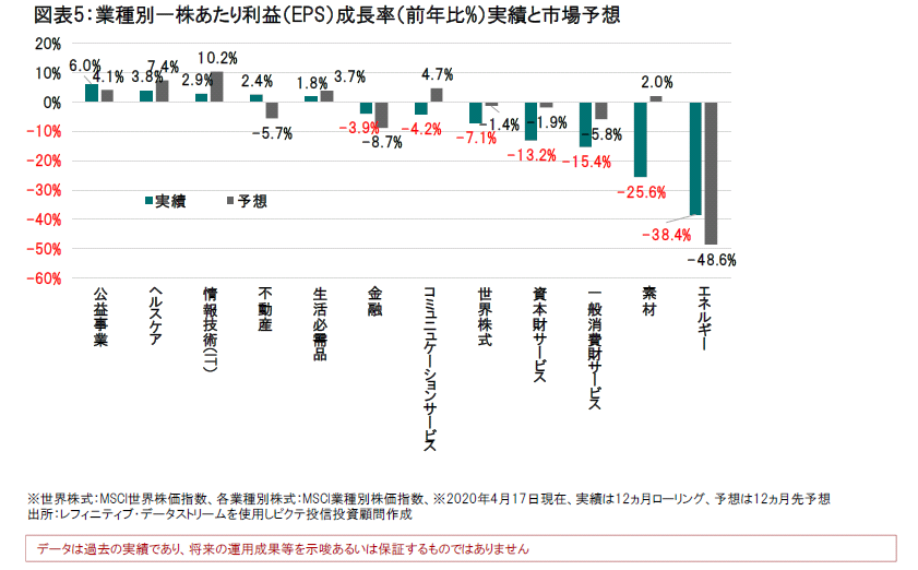世界の公益企業の利益成長率は足元の実績で前年比約6%、予想(12ヵ月先)で同約4%(2020年4月6日時点)となっており、原油価格の下落や景気後退の影響が大きいエネルギーや一般消費財サービスなどの実績が2桁のマイナスとなり、今期も減益が予想されるなか、公益をはじめとするディフェンシェブ性(景気の変動に左右されにくい特性)の高い業種やテレワークの拡大の恩恵を受ける情報技術(IT)セクターなどが底堅く推移しています(図表5参照)。