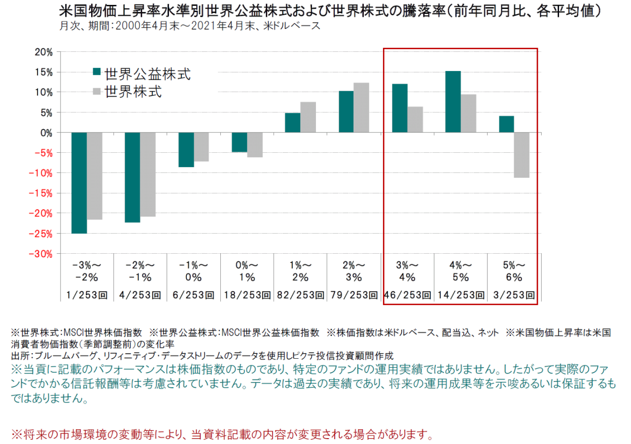 世界公益株式の騰落率と米国の物価上昇率の関係をみると、過去の実績(2000年4月末~2021年4月末)では、公益株式は、物価上昇率が高い方が、世界株式を上回って上昇する傾向がみられました(下図参照)。