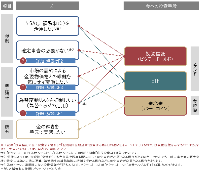 金への投資を行う主な手段には、「金現物」への投資と、金価格に連動する投資信託やETFなどの「ファンド」への投資があります。以下の図は主な特徴や相違点についてまとめたものです。個人のニーズ等に応じてメリット・デメリットとなる項目があるため一概に優劣を示すことはできませんが、金現物であれば貴金属としての金の輝きを手元で実感できること、ファンドであればNISA(非課税制度)の活用が可能注1であることや、税制面、保有面での手軽さなどが特徴であるといえます。また、「ピクテ・ゴールド」などの一部のファンドには米ドル・円の為替変動リスクを抑制する「為替ヘッジあり」の選択肢があります。