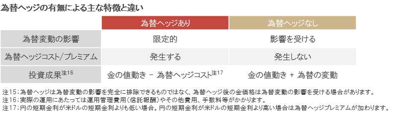 金などの外貨建て資産に投資する際の為替の変動による影響を抑えるために行う手段には、為替ヘッジがあります注15。なお、為替ヘッジを行うに際には為替ヘッジ「コスト」の支払い、もしくは為替ヘッジ「プレミアム」の受け取りが生じます。