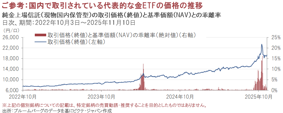 ピクテ・ゴールド(為替ヘッジあり/為替ヘッジなし)のような投資信託は、1日1回、毎営業日に委託会社が公表する基準価額で売買(設定/解約)が行われます。一方で、ETFは取引所の取引時間内であれば株式等と同様にリアルタイムでの売買が可能で、その取引価格(実際に売買できる金額)は取引所での需給によって変動します。ETFでも投資信託と同様に、基準価額(1口あたり純資産額、NAV)が算出されますが、これはETFの理論的な資産価値を表したもので、実際には投資家は必ずしも基準価額でETFを売買できるとは限りません。取引所での需給によっては基準価額よりも高い価格で取引されることもあれば、低い価格で取引されることもあるなど、取引価格と基準価額には乖離が生じる場合があります。