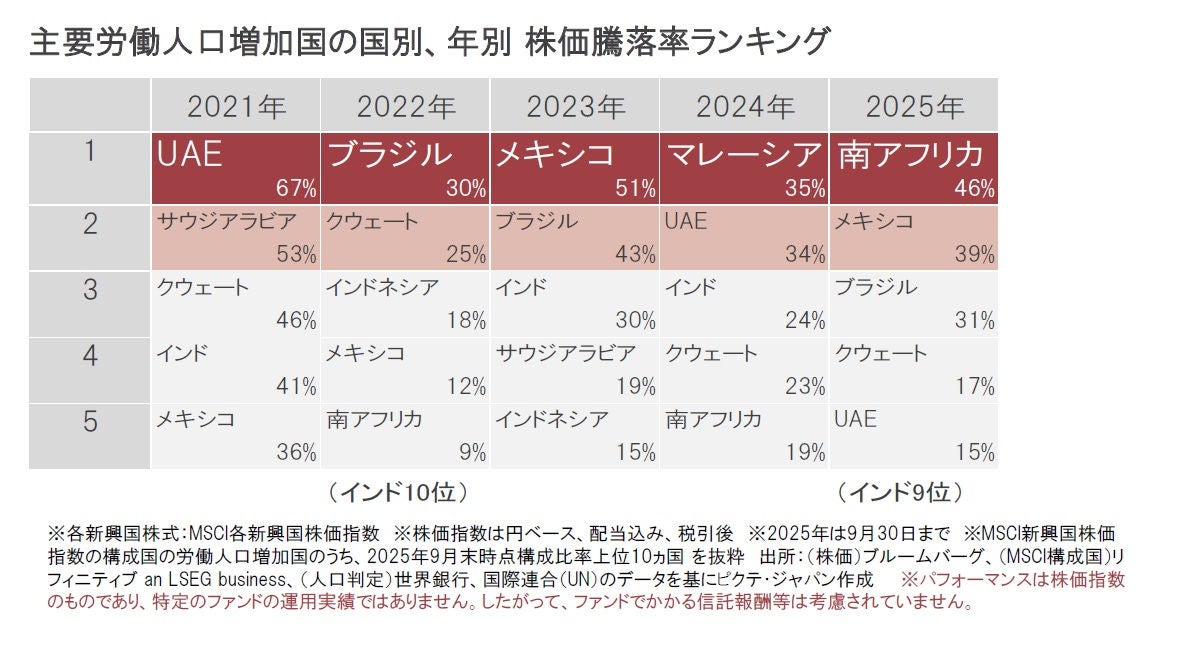 主要新興国のなかで最も高い経済成長率が予想されているインド株式投資に注目が集まっていますが、主要労働人口増加国の国別、年別株価騰落率ランキングを見ると、インドを上回るパフォーマンスを記録した国が多くみられます。ただし、毎年ランキングの上位国は入れ替わるため、インドを含む、労働人口増加国の株式を選別することで、中長期的に新興国の単一国投資を上回るパフォーマンスを達成することが可能であると考えられます。