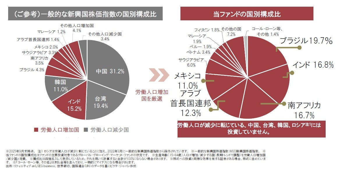 当ファンドでは、新興国の労働人口増加国の株式市場の銘柄について、詳細な分析を行い、バリュエーション(投資価値評価)等を勘案し、中長期的な業績成長が期待される銘柄を選別しています。
