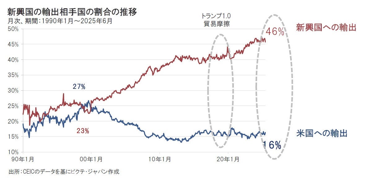 2000年以降、新興国の輸出に占める対米輸出の比率は減少する一方、新興国域内での貿易が拡大してきました。貿易構造変化の動きは、長期的には新興国各国の経済的な結びつきの多様化と新興国の存在感強化につながるとみれらます。