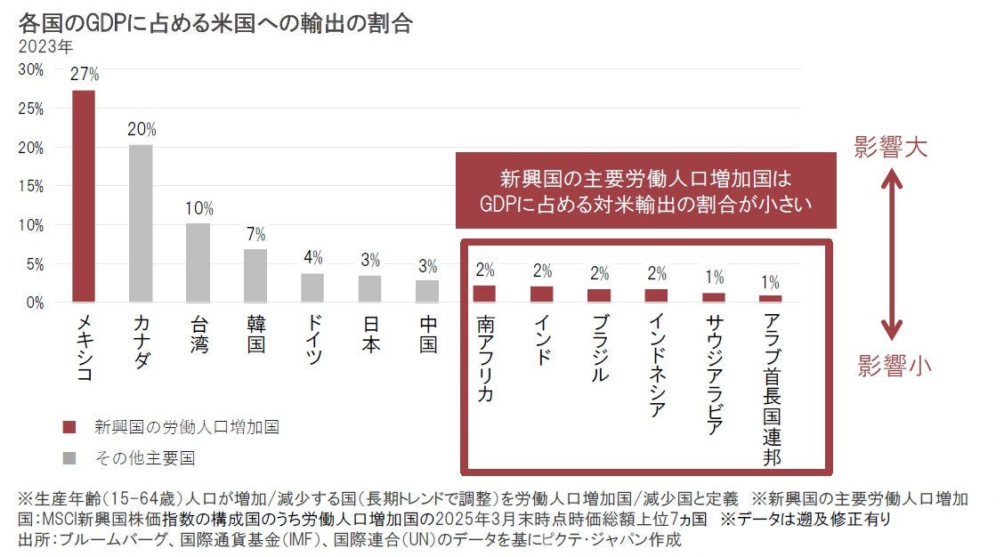 追加関税・相互関税の影響に関しては、その国のGDP(国内総生産)に占める米国への輸出の割合が高い国ほどマイナスの影響が大きくなります。新興国の労働人口増加国のGDPに占める米国への輸出の割合(2023年)はメキシコなどを除くと2%以下と低い水準です。