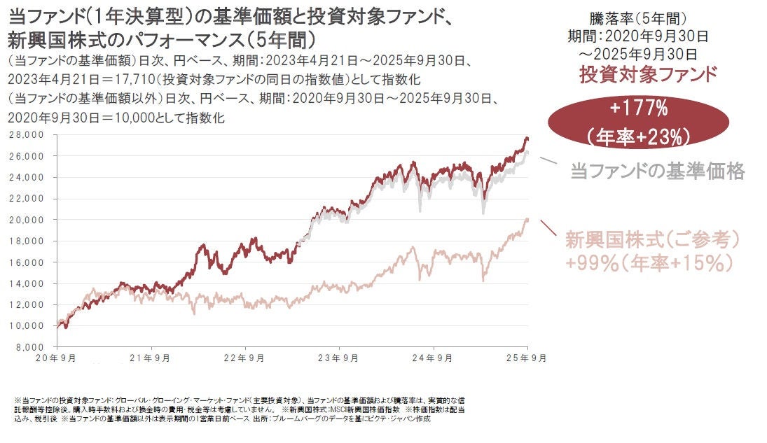 ■ 当ファンドの投資対象のパフォーマンスは、5年間で新興国株式を上回る