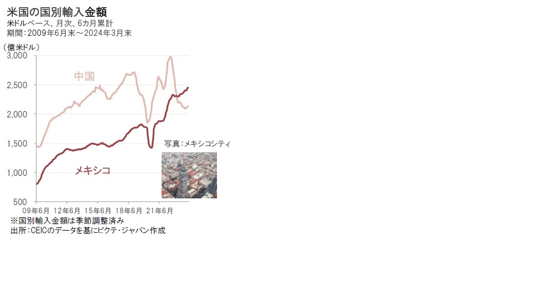 米国の大統領選挙では、両党とも中国に対する関税強化を示しています。民主党のバイデン政権は米国・メキシコ・カナダ協定(USMCA)では厳しい原産地規定により中国製のEVや鉄鋼・アルミなどへの制裁関税を引き上げることを明らかにしています。共和党の候補指名が濃厚になったトランプ前大統領は、中国からの輸入に6割超の関税をかけると発言しています。