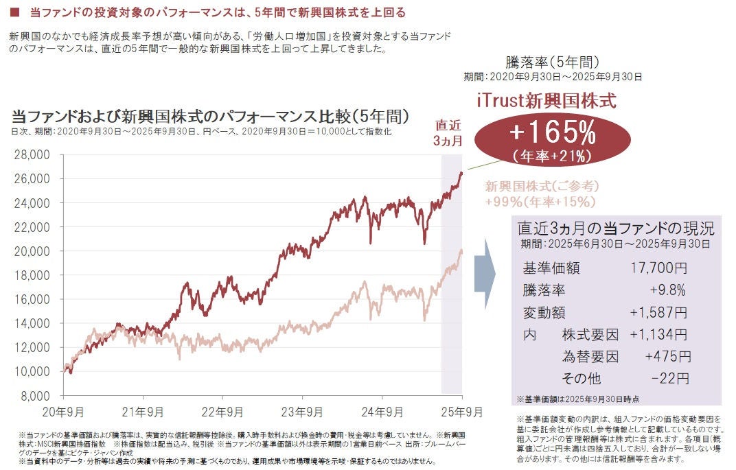 主要労働人口増加国の年初来の騰落率*では、当ファンドが一般的な新興国株式よりも、組入れを高位にしていた南アフリカ、メキシコ、ブラジルなどは、円ベースで+11~23%と上昇しました。 * (MSCI新興国株価指数の構成国の労働人口増加国、2025年9月末時点構成比率上位10ヵ国のうち)
