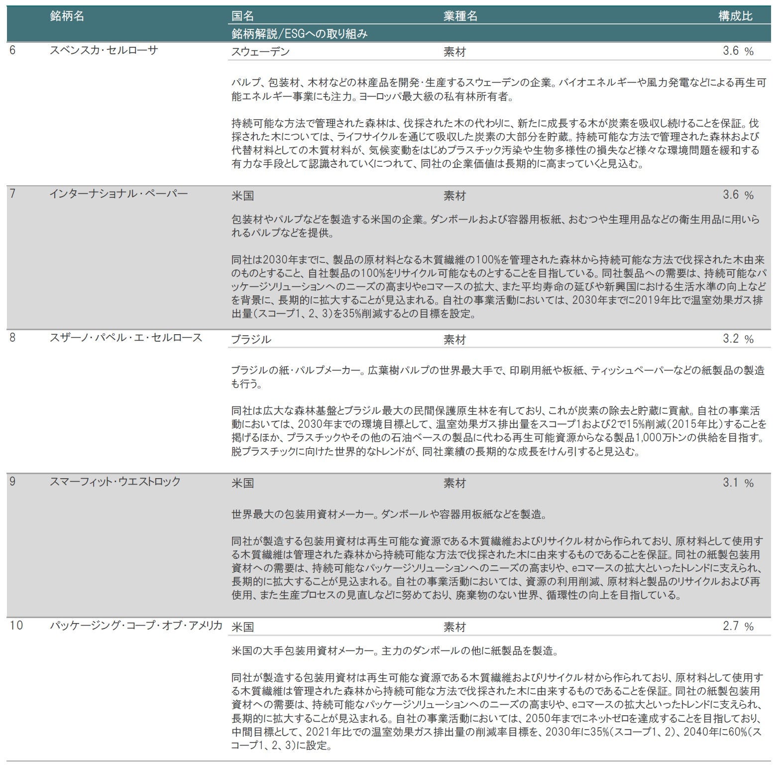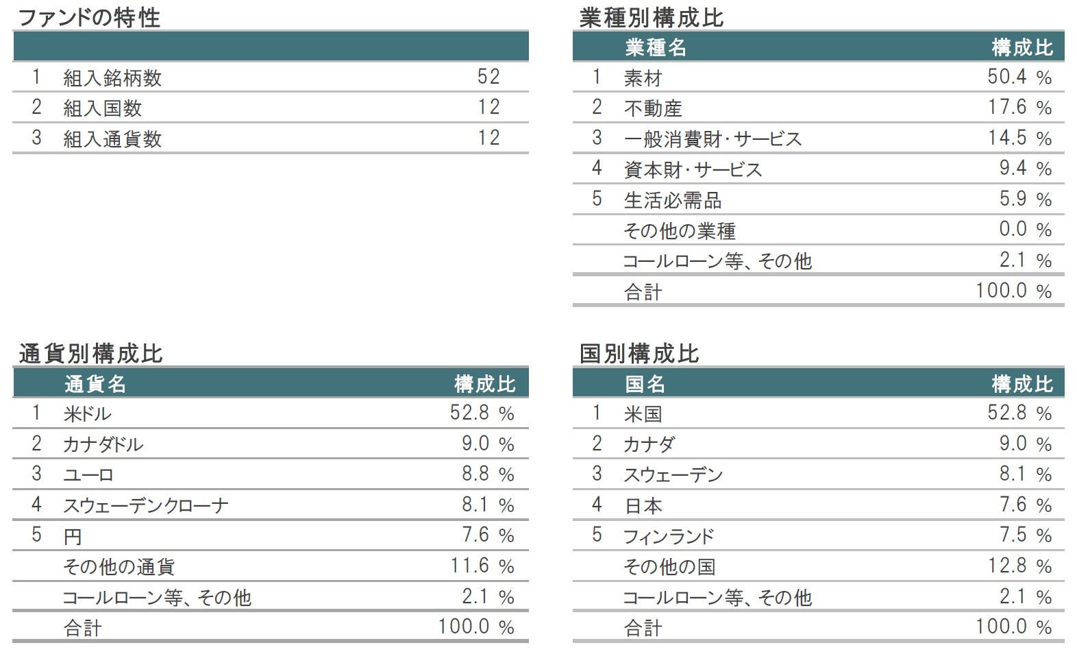 業種別構成比は、素材が50.4%と過半を占めています。素材には、木材製品関連や包装材関連、紙製品関連の銘柄などが含まれます。その他の組入業種は、不動産(北米を基盤とする森林リート)、一般消費財・サービス(住宅建設業者やホームセンター運営会社など)、資本財・サービス(建築資材メーカーや産業機器メーカーなど)、生活必需品(衛生用品メーカーなど)などとなっています。