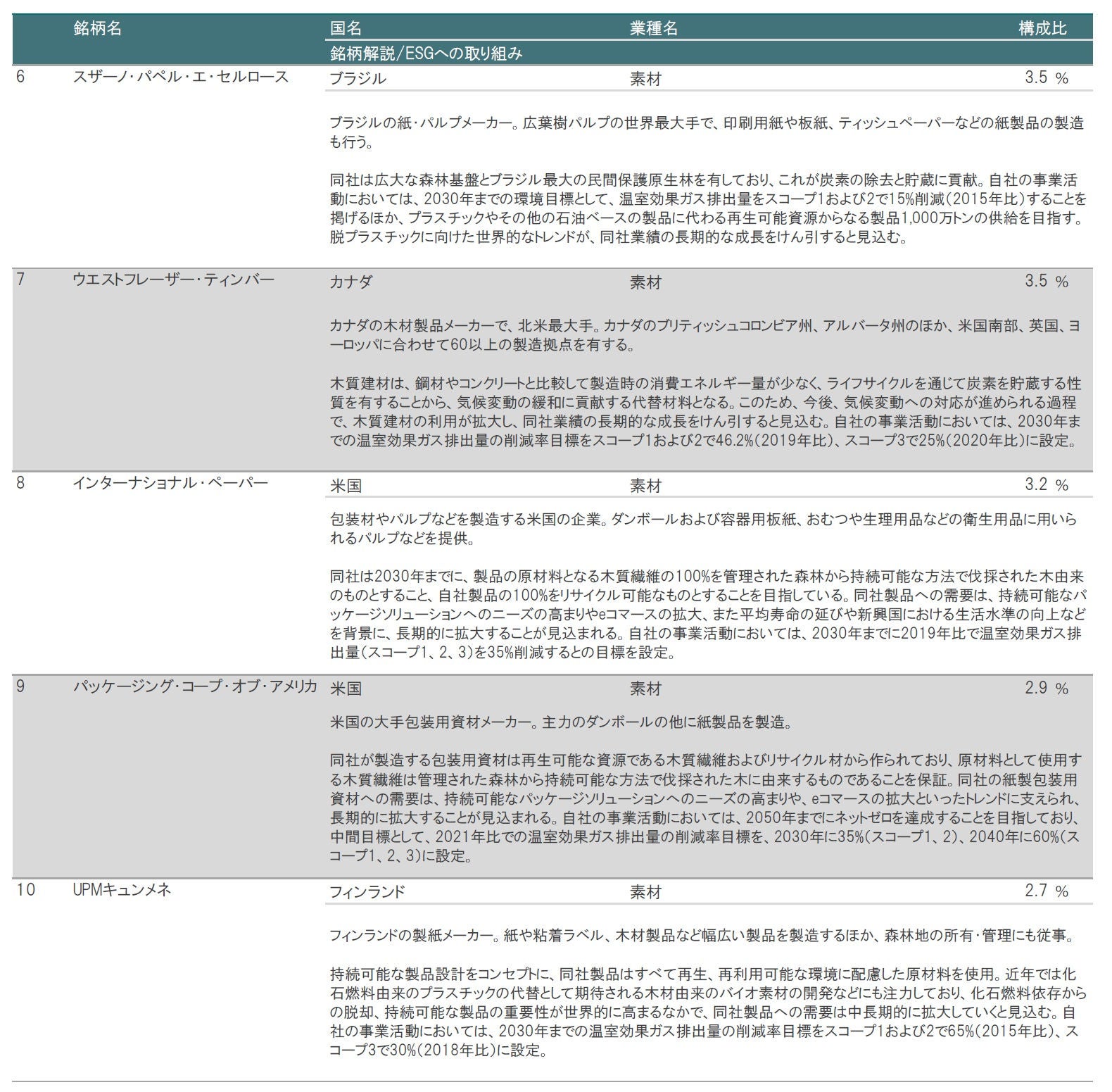 業種別構成比は、素材が50.4%と過半を占めています。素材には、木材製品関連や包装材関連、紙製品関連の銘柄などが含まれます。その他の組入業種は、不動産(北米を基盤とする森林リート)、一般消費財・サービス(住宅建設業者やホームセンター運営会社など)、資本財・サービス(建築資材メーカーや産業機器メーカーなど)、生活必需品(衛生用品メーカーなど)などとなっています。