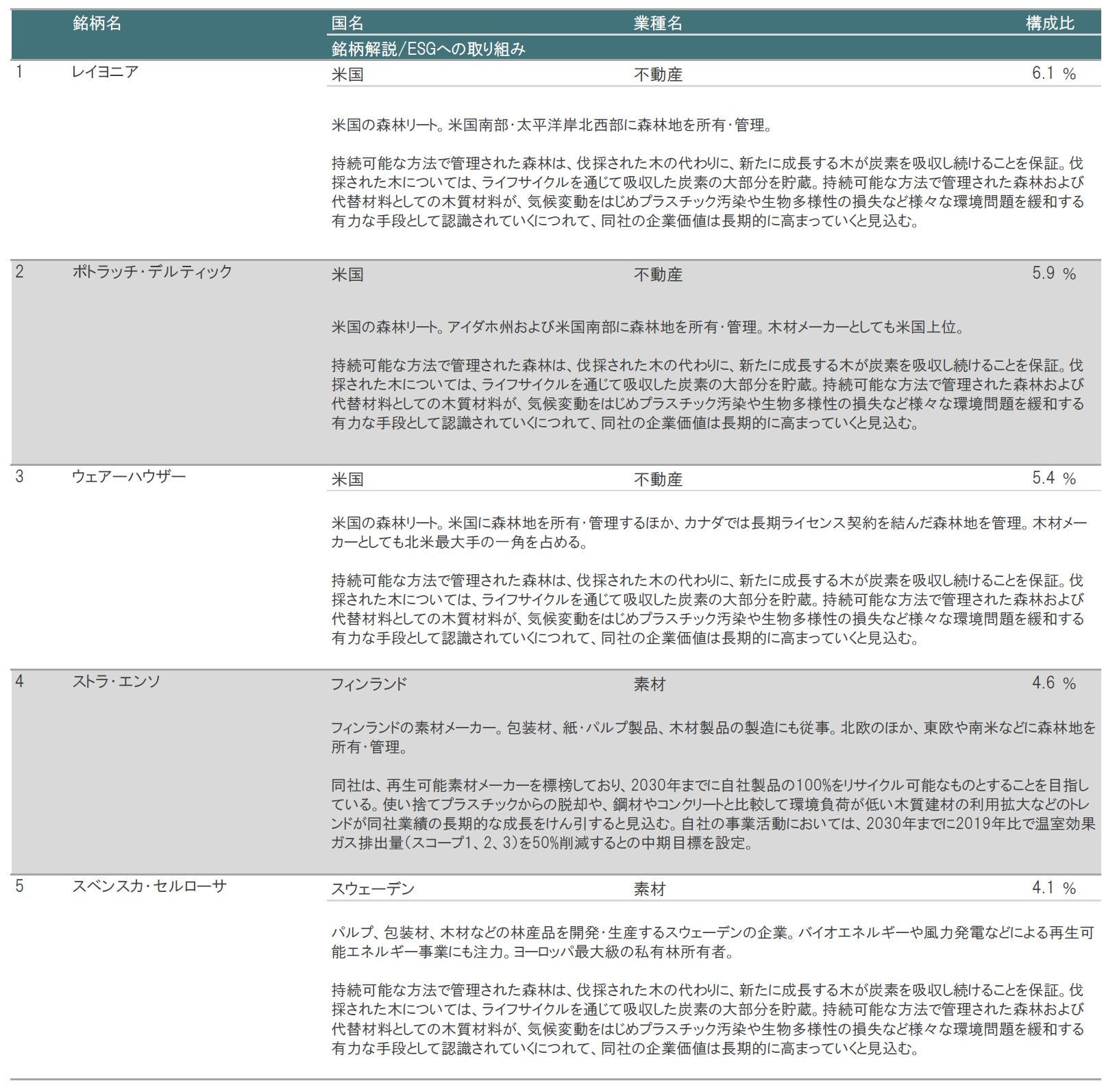 業種別構成比は、素材が50.8%と過半を占めています。素材には、木材製品関連や包装材関連、紙製品関連の銘柄などが含まれます。その他の組入業種は、不動産(北米を基盤とする森林リート)、一般消費財・サービス(住宅建設業者やホームセンター運営会社など)、資本財・サービス(建築資材メーカーや産業機器メーカーなど)、生活必需品(衛生用品メーカーなど)などとなっています。