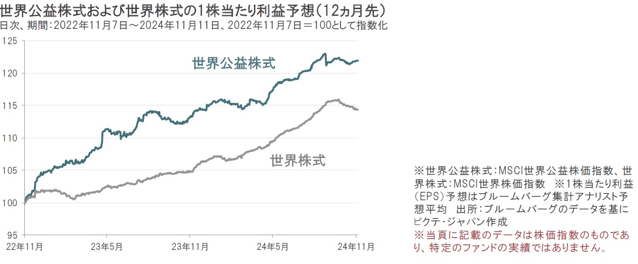また、世界公益株式のバリュエーション(投資価値評価)は、高い利益成長見通しにもかかわらず、現在、魅力的な水準であることから、中長期的な投資機会を提供するとみています。