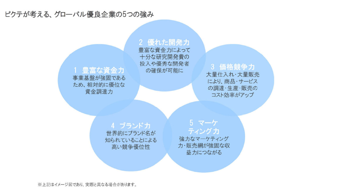 当ファンドの投資対象であるグローバル優良企業には、①豊富な資金力、➁優れた開発力、➂価格競争力、④ブランド力、➄マーケティング力といった5つの点で優位性があり、それらの優位性があるがゆえ、相対的にみるとしっかりとした収益・財務基盤の実現につながると考えられます。また、しっかりとした収益・財務基盤を有することで、困難な事業環境で一時的に業績が悪化したとしても、それを相対的にうまく乗り越えて、次なる成長ステージを迎えることができるとも考えられ、中長期的にみると世界の企業平均を上回る利益成長力があると考えられます。
