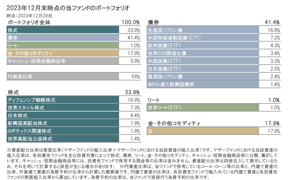 2023年12月末時点のポートフォリオの構成比は、株式33.9%、債券41.4%、リート1.0%、金・その他コモディティ17.9%、キャッシュ・短期金融商品等5.9%となっています。