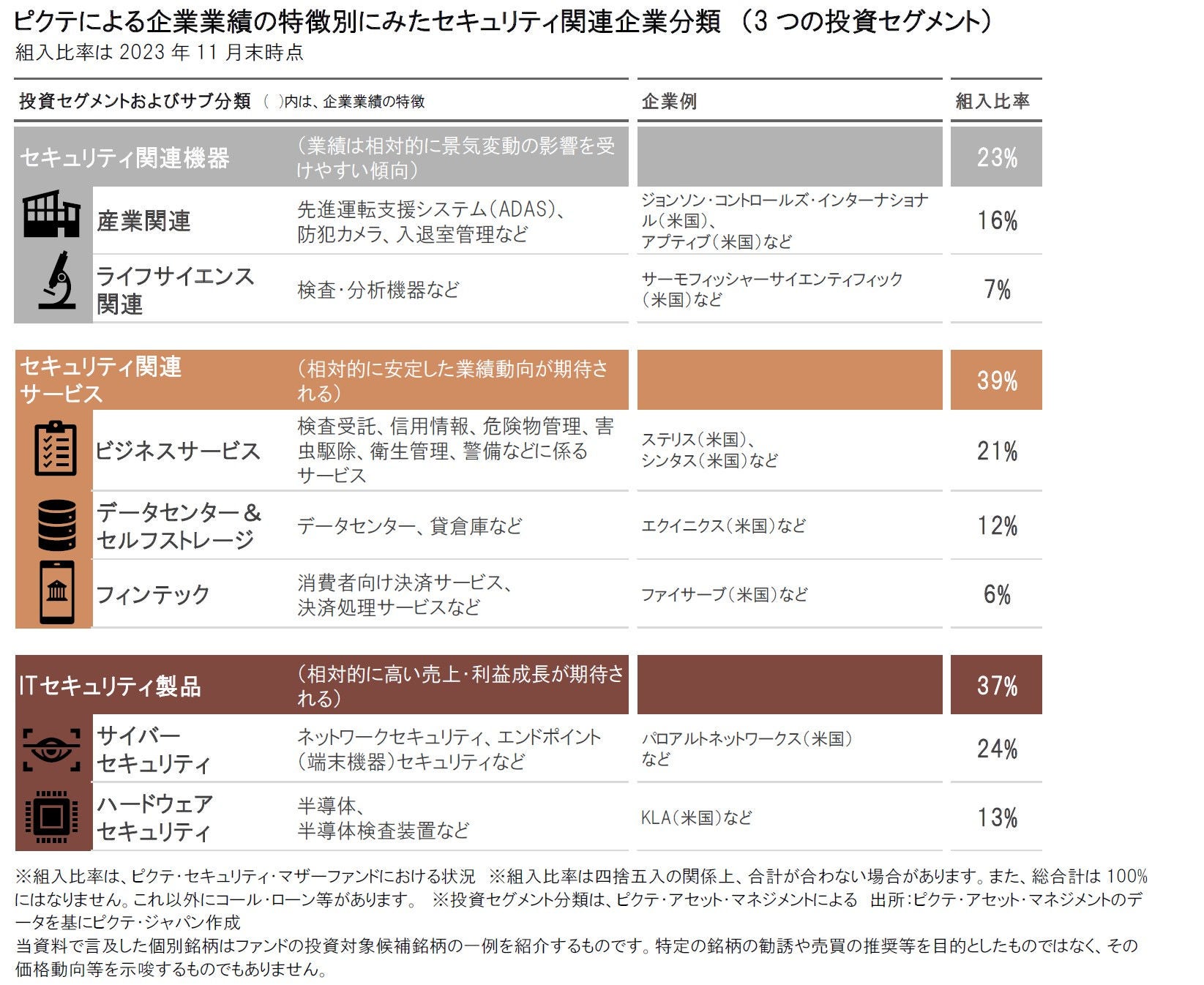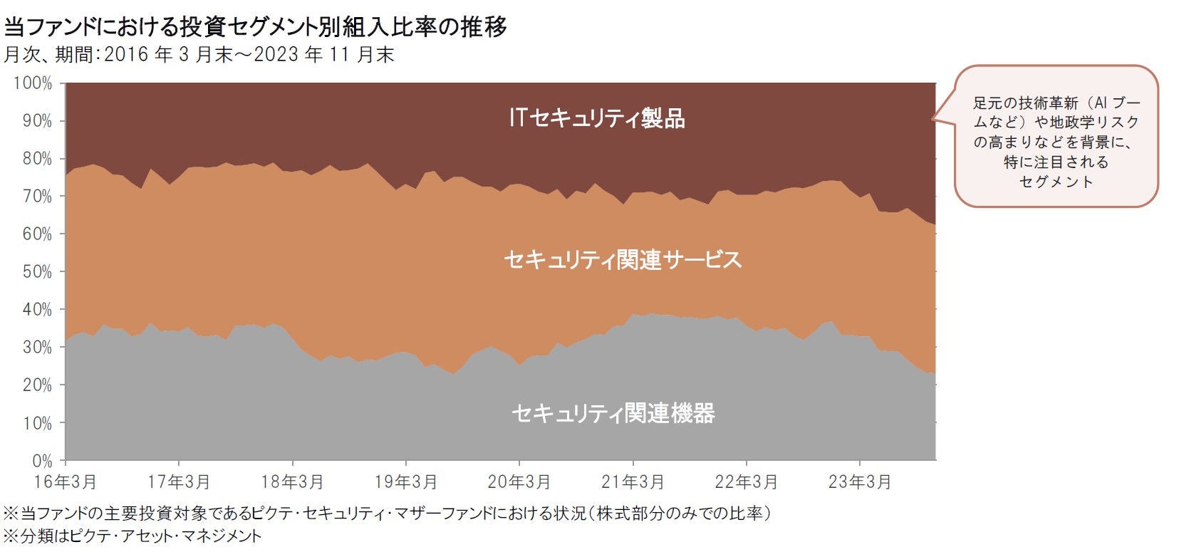 こうした見通しに基づき、足元では、「ITセキュリティ製品」の組入比率を相対的に高めています。一方、「セキュリティ関連機器」については、組入比率を相対的に低位としています。