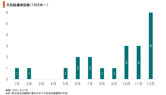 過去21回の総選挙のうち、12回は10-12月に行われた。秋の臨時国会で解散し、次年度の予算審議前に選挙を終わらせる意図だろう。一方、1-5月は2回に留まる。予算案、重要法案の審議があるからではないか。これに五輪日程などを考えると、次の総選挙の時期は、6月の都議会議員選挙との同日選、もしくはパラリンピック直後となる可能性が強い。