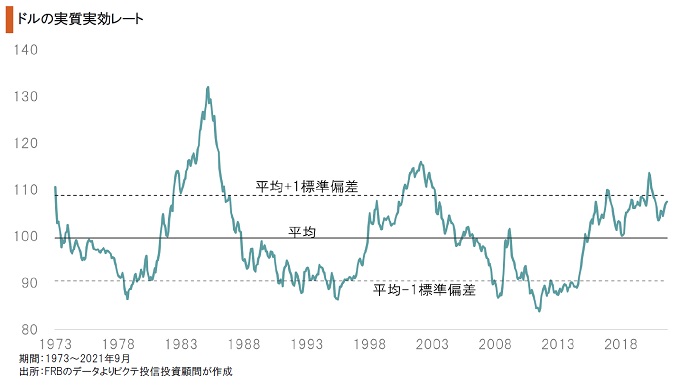 ドルの実質実効レートは高値圏にある。ビル・クリントン、バラク・オバマ両大統領は、就任当初、資産バブル崩壊、リーマンショックから経済を立て直す上でドル安政策を採用した。新型コロナ禍の下、同じ民主党のジョー・バイデン大統領もドル安を受け入れると予想されたものの、現実は異なるようだ。物価上昇圧力を緩和するには、強いドルが望ましいからではないか。
